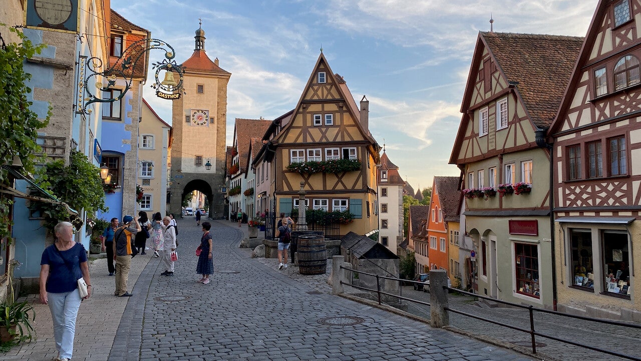 In Rothenburg ob der Tauber hebben we geluk, er is nog plaats over op de staanplaats aan de rand van het stadje. Een kleine rustpauze en dan gaat het direct naar de stad waar we ooit twee weken verbleven. We herinneren ons de toegangspoorten, de straten en de pleinen en ook het hotelletje waar we toen waren is nog steeds open voor gasten.
