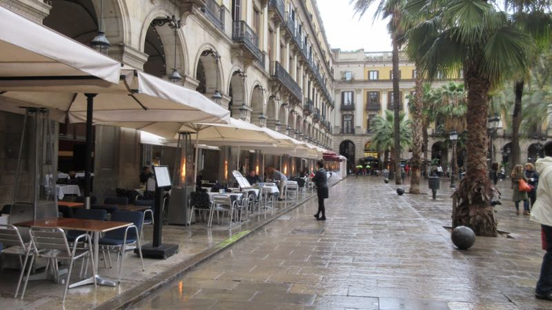 Het regent zachtjes wanneer we ’s morgens de trein van lijn R1 nemen richting Plaça de Catalunya in het centrum van Barcelona.