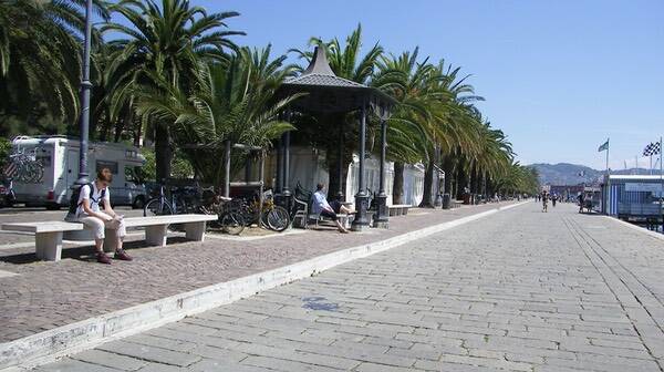 Langs de baai loopt een promenade van een goede km lang. Links een park met palmbomen en rechts het blauwe water van de baai. Hier vertrekt de traghetto die via Portovenere naar de dorpjes van de Cinque Terre gaat.