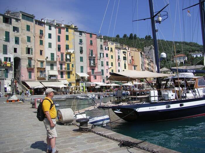 In de tabaccheria zijn er nog genoeg buskaartjes en we nemen de bus naar Portovenere. Het heeft de vorige dag gebrand in de bosjes langs de kustweg en van de sentiero zal er nu zeker geen spoor meer te bekennen zijn. Met de bus is trouwens comfortabeler dan te voet langs de baan. Van uit de bus hebben we een prachtig zicht op de baai en na 10min staan we al aan het centrale plein(tje) van Portovenere. Er waait een stevige bries wanneer een zeilboot langzaam de haven binnenvaart.