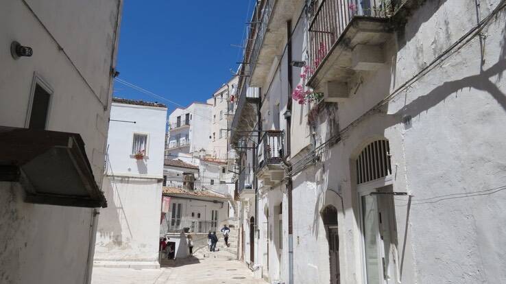 De zon schijnt maar een kille wind blaast door de witte straatjes van Monte Sant’Angelo. Vele trappen leiden naar pleintjes waar wasgoed langs de gevels te drogen hangt. Onverwacht kom je aan de rand van het stadje, aan andere pleintjes met doorkijken naar de zee die 20km verder in de diepte glinstert.