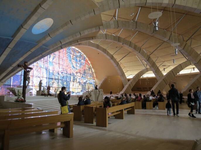 Langs een trappengallerij kom je in een prachtige grotkerk, waar de missen elkaar in een strakke regie opvolgen. Biechtstoelen staan langs de muren en rijen zondaars wachten geduldig hun beurt af.
