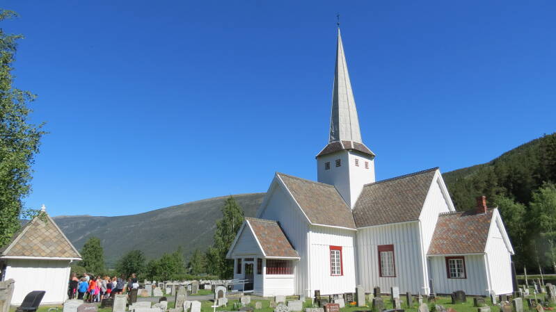 Voor onze middaglunch hebben we de parking van een wit, spijtig genoeg gesloten kerkje langs de E6 gekozen. Verder naar het zuiden in Sel zien we nog een klein wit kerkje met een hoop auto’s op de parking. Het is een erg bekend houten kerkje, gebouwd in 1742. Na het bezoek moeten we besluiten dat niet enkel de stavkerken erg mooi zijn, ook deze kerk heeft een speciaal en ditmaal kleurig interieur.