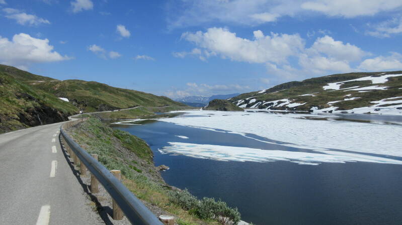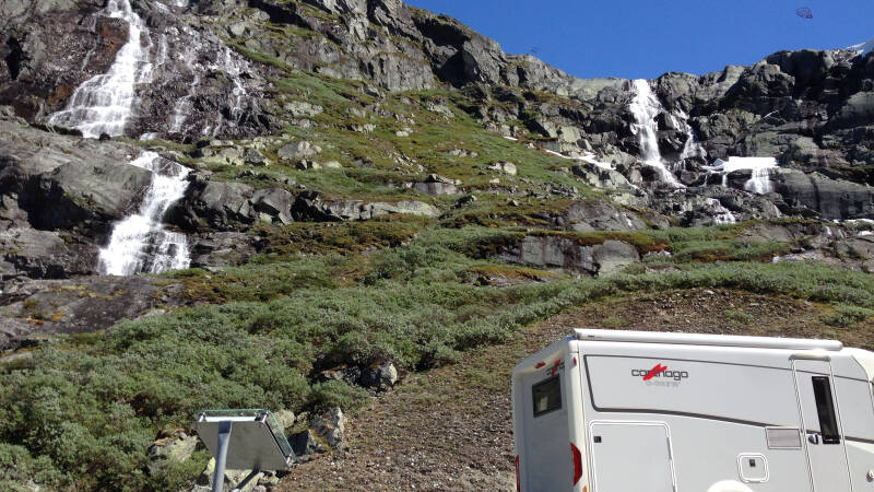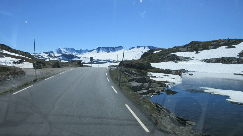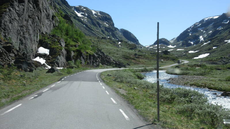 We trekken terug de bergen in, route 13 of de Vikafjellsvegen richting Voss. Het is geen officiële toeristische weg maar ook deze weg geeft toegang tot een prachtig berglandschap. Het gaat langs sneeuwvelden en ijsmeren, over bergen en afdalend langs haarspelbochten naar een vallei waar schapen aan de voet van een bulderende waterval de dode vliegen van de motorhome likken.