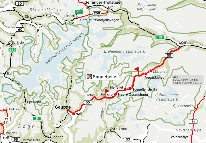 Na het inkopen draaien we route 55, de Sognefjellet op. Van de groene weiden in Bøverdalen kan je al een glimp opvangen van hoge bergen in de verte. De weg stijgt langzaam door de vallei naar 1434m, wat het de hoogste bergpas van Noord-Europa maakt.