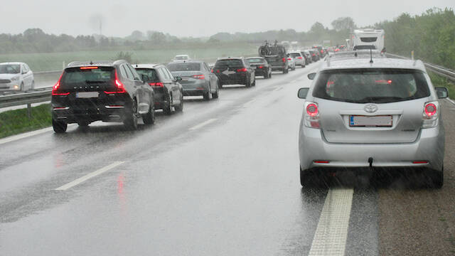 Regen, file door regen, file door een ongeval voor de Stœrebeltbrug en 11 graden. Telkens het verkeer stokt wordt er automatisch een veiligheidsstrook vrij gelaten.